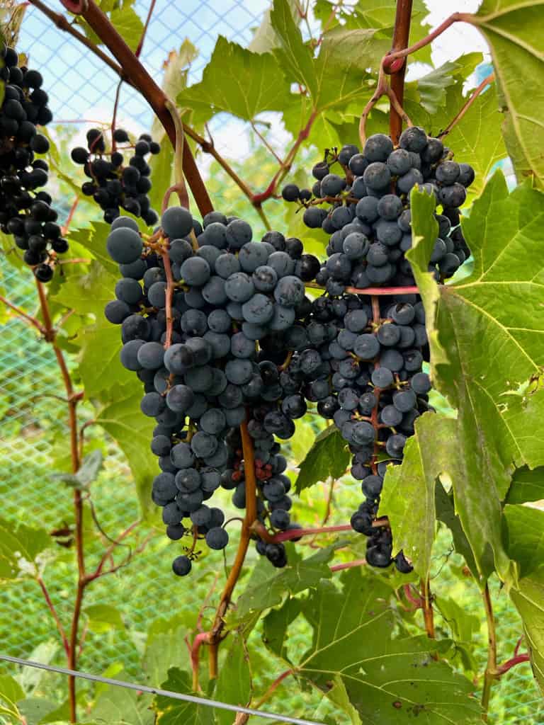 Clusters of ripe, dark purple Frontenac grapes hanging on the vine, surrounded by green leaves and set against a background of protective vineyard netting.