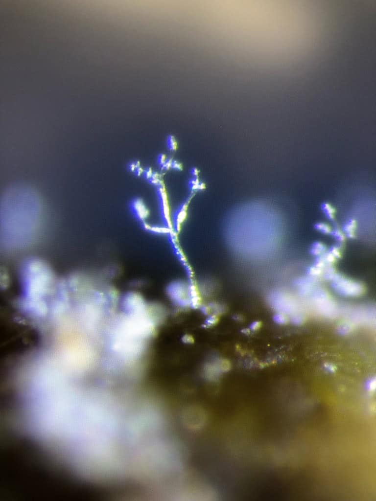 Microscopic image of the Plasmopara viticola (downy mildew) pathogen, showing a delicate, branching structure with a glowing, spore-bearing appearance under magnification.