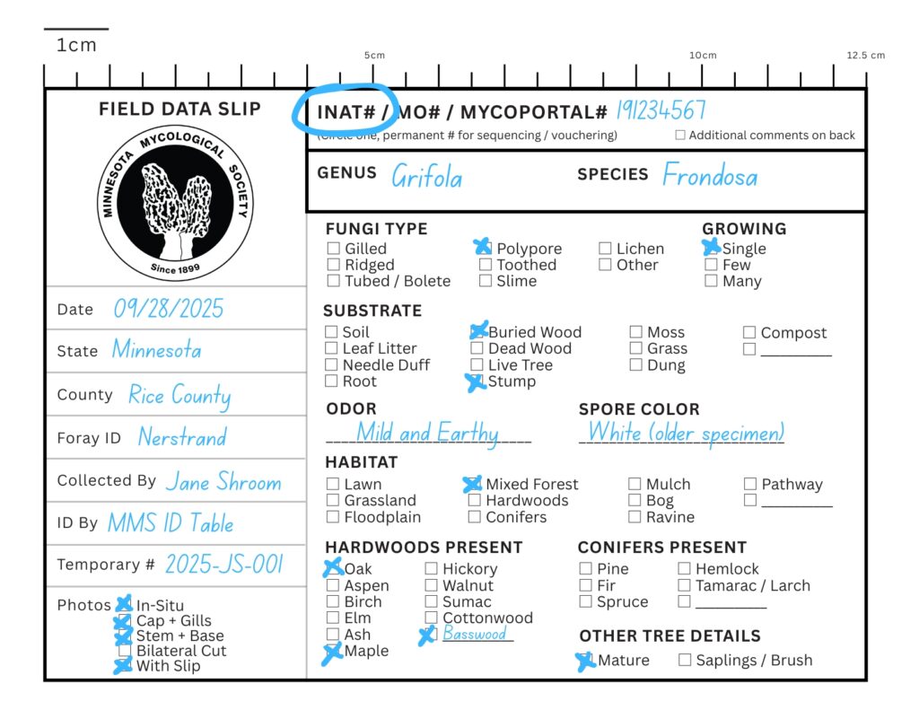 | Temporary # | Your personal tracking number for tracking the specimen. | 2025-JS-001, #022_bolete, Fall-Foray-7, blank if not used |