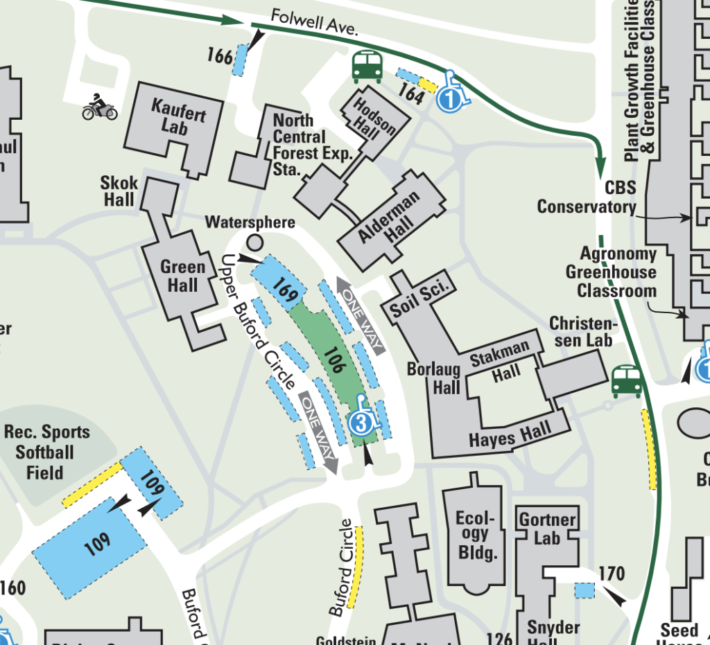 Parking is in lot 106 inside Buford Circle in front of Borlaug Hall. From U of M website: The cost is $1/hour after 3 pm on weekdays and on weekends. You can pay from your vehicle at exit – credit card only or at lobby paystations – cash and credit card (Mastercard, Visa, American Express, Discover). In the map below, Green=visitor parking, Yellow=meter parking,Blue=contract parking.